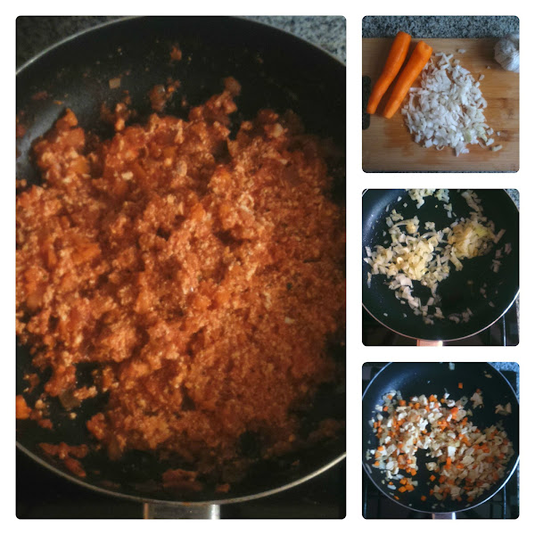 Después, en la misma sartén, pochamos la zahanoria y añadimos la cebolla, el tofu previamente cortado en taquitos, y medio bote de tomate.