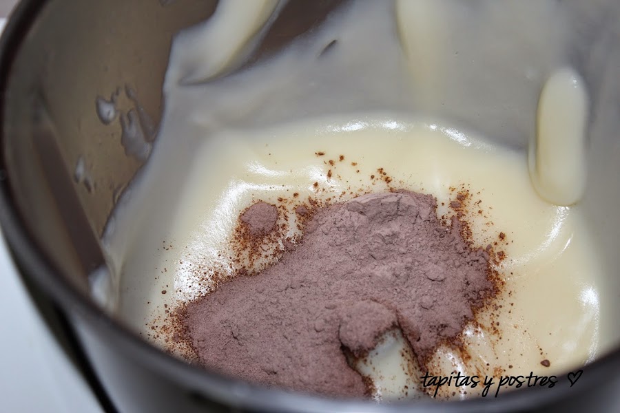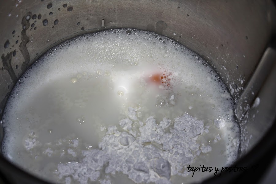 Mientras hacemos la crema pastelera. Todos los ingredientes al vaso menos el cacao.