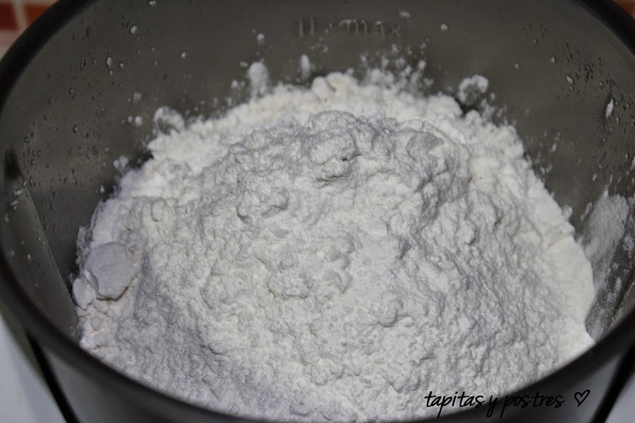 Añadimos la harina y la sal y mezclamos 20 segundos a velocidad 4 y luego amasamos 3 minutos, vaso cerrado a velocidad espiga.