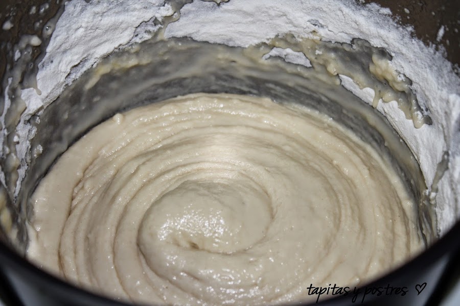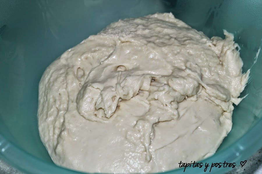 Luego amasamos y dejamos reposar en un bol. Una horita. Sale una masa muy pegajosa.