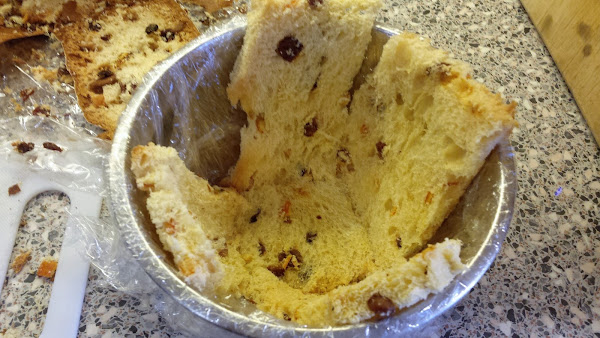 Luego cortamos rebanadas finas de panettone y les quitamos la corteza, seguidamente vamos forrando el molde enfilmado con las láminas de panettone. No te preocupes si no encajan perfectamente, el panettone es una masa tipo brioche que puedes apretar y puedes añadir trocitos en los huecos que queden, luego aprietas y queda como soldado, como si trabajases con plastelina.