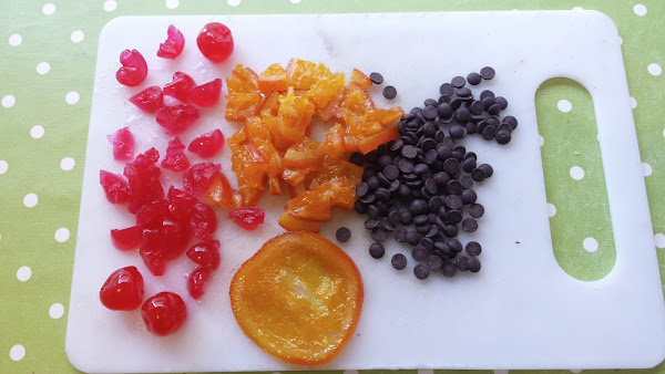 Para preparar el relleno cortamos la ruta confitada en trocitos, y preparamos los trocitos de chocolate. Yo he usado pepitas de chocolate de las que ya vienen preparadas pero puedes usar chocolate del que tu prefieras, negro o con leche, y rallarlo o cortarlo en pedacitos.