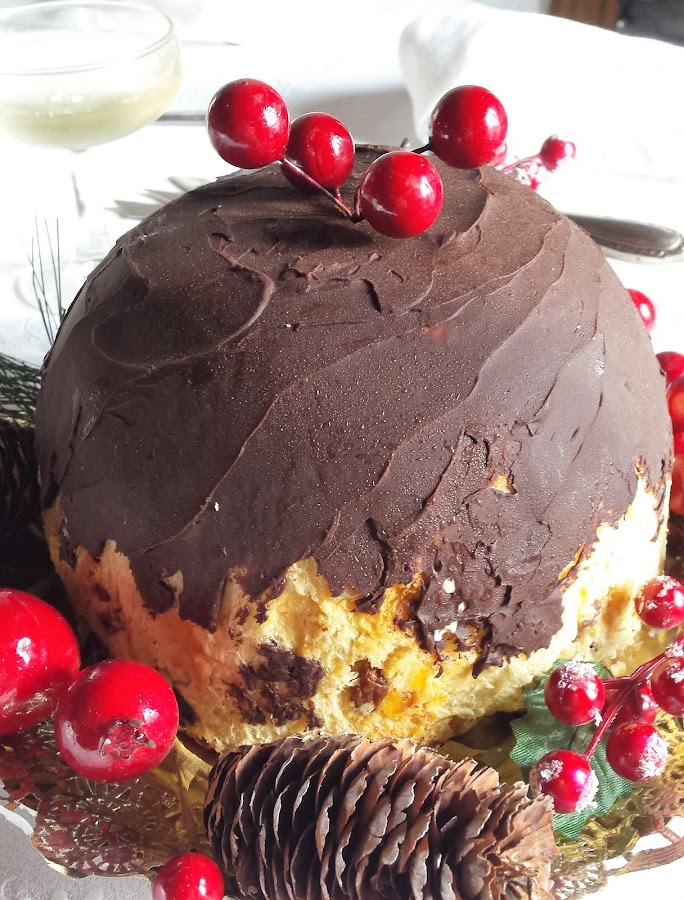Es el postre que se comerá en mi casa el día 1 de enero, la maravillosa bomba de panettone rellena de helado, frutas confitadas y cubierta de chocolate Cuando la sirvo a la mesa en una bandeja dorada y decorada con piñas y bolas rojas todo el mundo se queda con la boca abierta, ¡es espectacular! Y el corte es... ¡Impresionante!