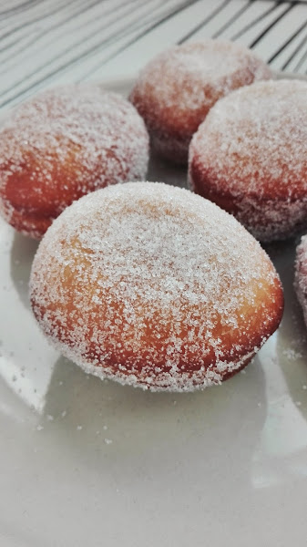 Las sacamos dejándolas sobre papel absorbente, rebozamos con azúcar y dejamos entibiar antes de rellenar.