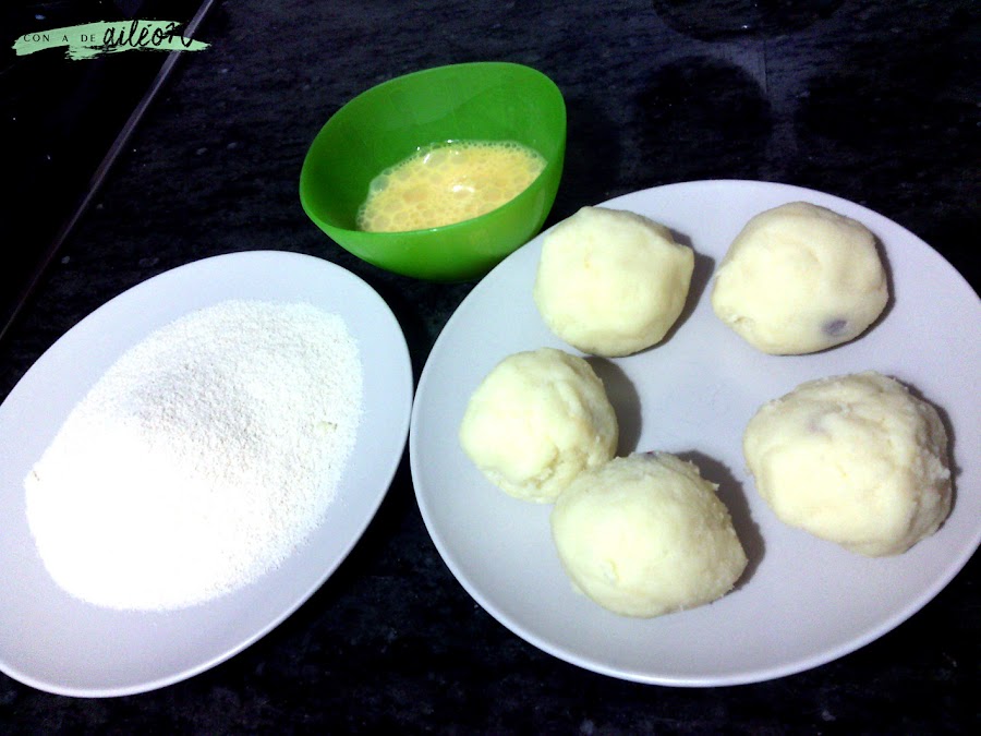 Empezamos haciendo un puré de patatas normal y corriente, con su sal, su aceite o mantequilla y su chorradita de leche si se desea, lo importante es que no quede muy suelto, sino más bien espeso para poder luego hacer bolas con él. Dejamos enfriar un poco.
