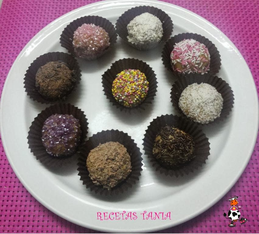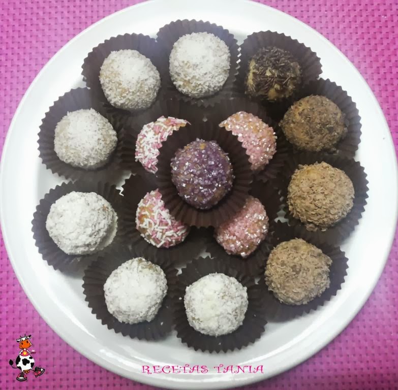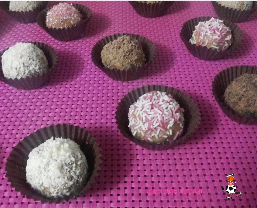 Trituramos las galletas y las almendras,lo ponemos en un bol y mezclamos. Añadimos la leche condensada,mezclamos todo bien y dejamos unos 30min en la nevera. Pasado este tiempo hacemos las bolitas y las vamos pasado algunas por coco rallado,otras por chocolate,por fideos de colores,brillatitos de caramelo (al gusto).Colocamos en unas mini capsulas para bombones y guardamos en la nevera.