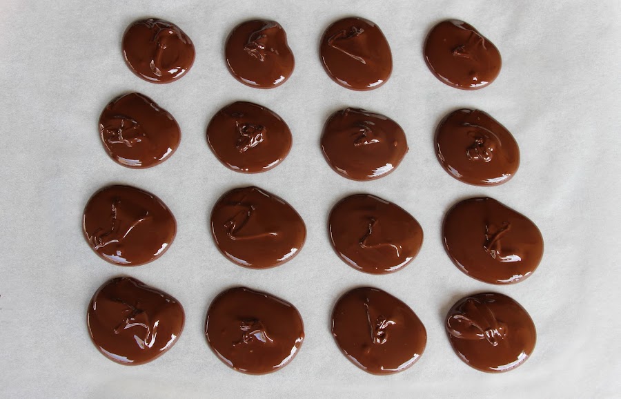 En una placa con papel sulfurizado, hacer círculos de chocolate con una cuchara.