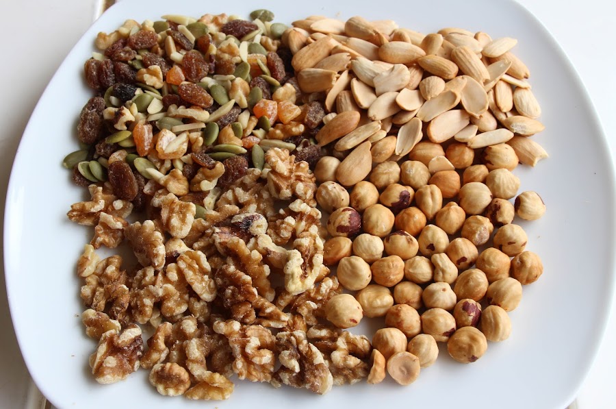 -frutos secos variados. En mi caso, avellanas, almendras, nueces, pipas de calabaza, pasas y albaricoques desecados. Compré un combinado de frutos secos en Mercadona, os lo recomiendo porque de allí utilicé las pipas de calabaza, pasas y albaricoques desecados, ya que me resulta más práctico comprar esta mezcla que no ir comprando pequeñas cantidades de estos frutos que no solemos comer.