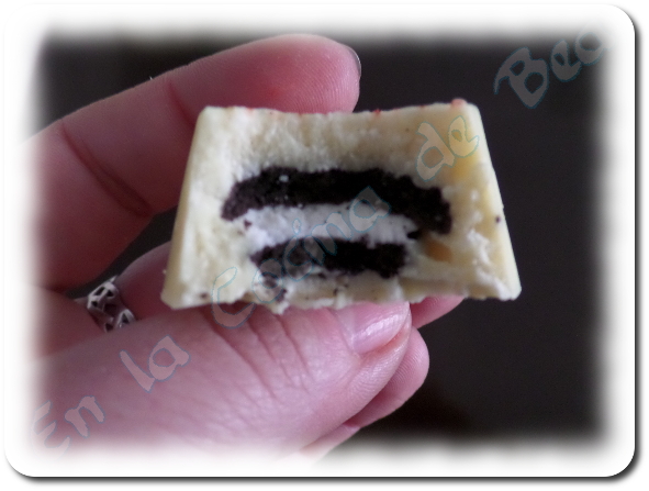 Vertemos un poco de chocolate sobre el transfer, para cubrirlo y, sobre este, ponemos una galletita Oreo. Terminamos de cubrir con chocolate, damos unos golpecitos, para que se coloque bien y no queden burbujitas, y dejamos enfriar, en un sitio fresco y seco. Si fuera verano, al frigorífico.