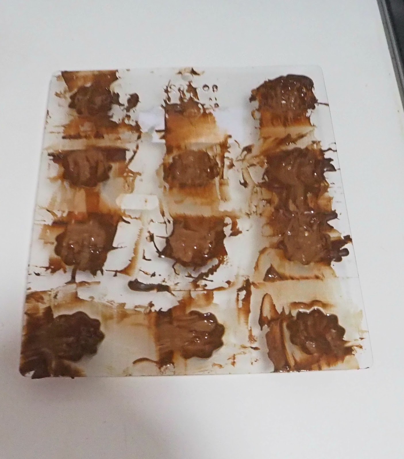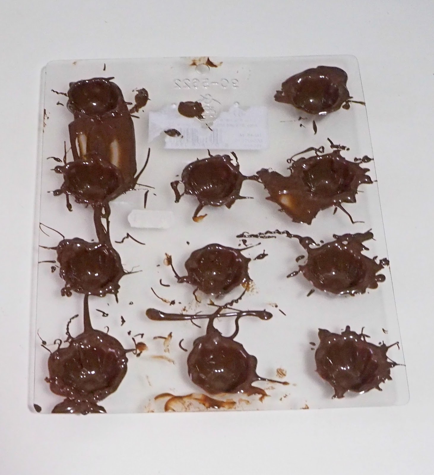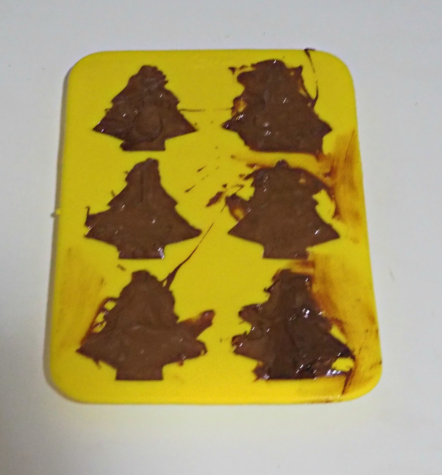 - Rellenamos los huecos de los moldes y quitamos el exceso con una espátula. Como podéis ver el las fotos, el molde me quedó lleno de chocolate, aquello no tenía buena pinta, jeje, pero tranquilos si os pasa porque el resultado final es perfecto.