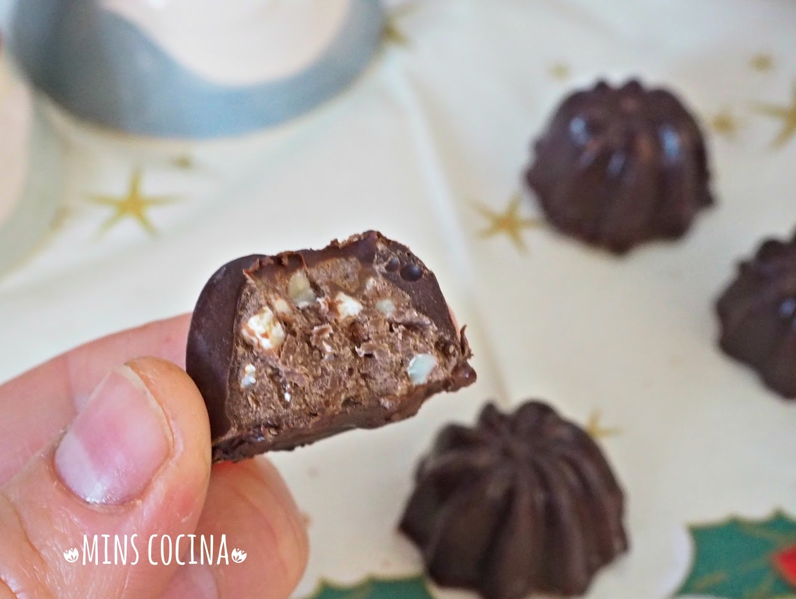 - Por último, derretimos un poco más de chocolate negro y tapamos los huecos, cerramos el bombón. Metemos el molde a la nevera al menos 1 o 2 horas hasta que se enfríe y endurezca la mezcla. Después ya podemos desmoldar y servirlos o guardarlos en una lata donde duran mucho tiempo en un lugar fresco y seco. Ya veréis lo riquísimos que quedan. Para lucirnos estas fiestas y todo el año.