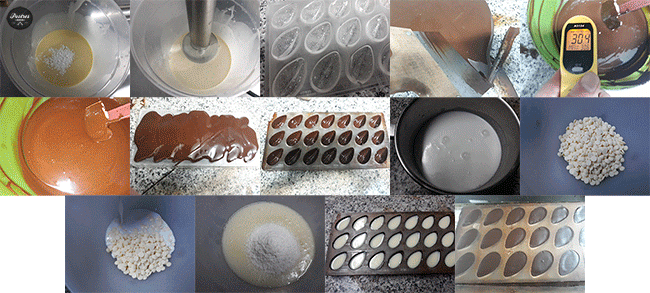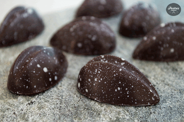 Después procedemos a sellar los bombones, atemperamos el resto del chocolate negro y vertemos encima, le pasamos la espátula para retirar el exceso y dejamos cristalizar 24 horas más. Desmoldamos.