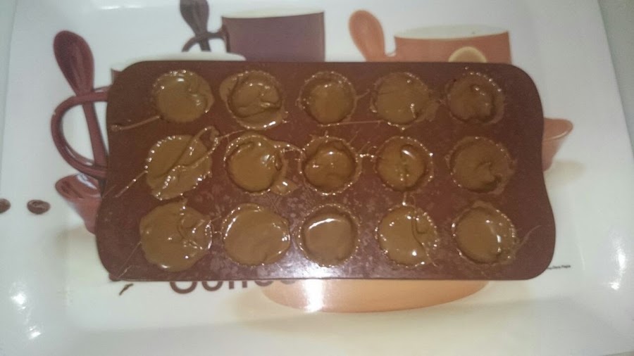 Por último cubrimos el molde con el chocolate y volvemos a meter en el frigorífico, hasta que endurezca, una vez duros los bombones, se desmoldan y a disfrutar!!!!!!