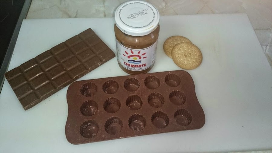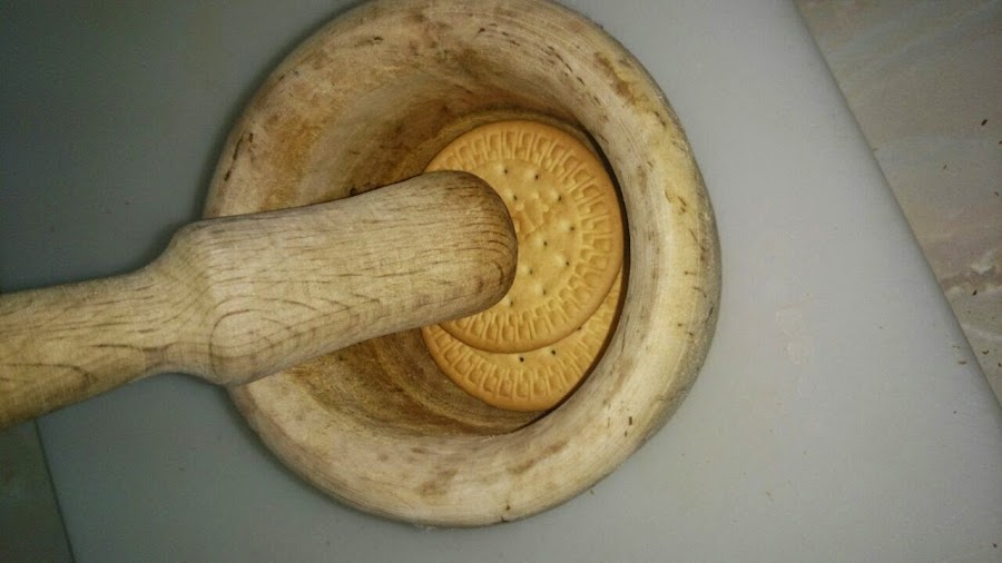 Cuando esté duro el chocolate, sacamos el molde del frigorífico y procedemos al relleno, yo en este caso, los he rellenado de crema de leche y galletas trituradas, para ello machacamos las galletas en un mortero, poned primero dos galletas y si os hace falta mas, vais machacando de una en una, depende de los bombones que queráis rellenar.