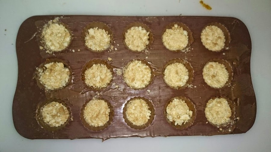 A continuación echáis con una cucharita, un poco de dulce de leche en cada bombón y después un poco de galleta machacada .