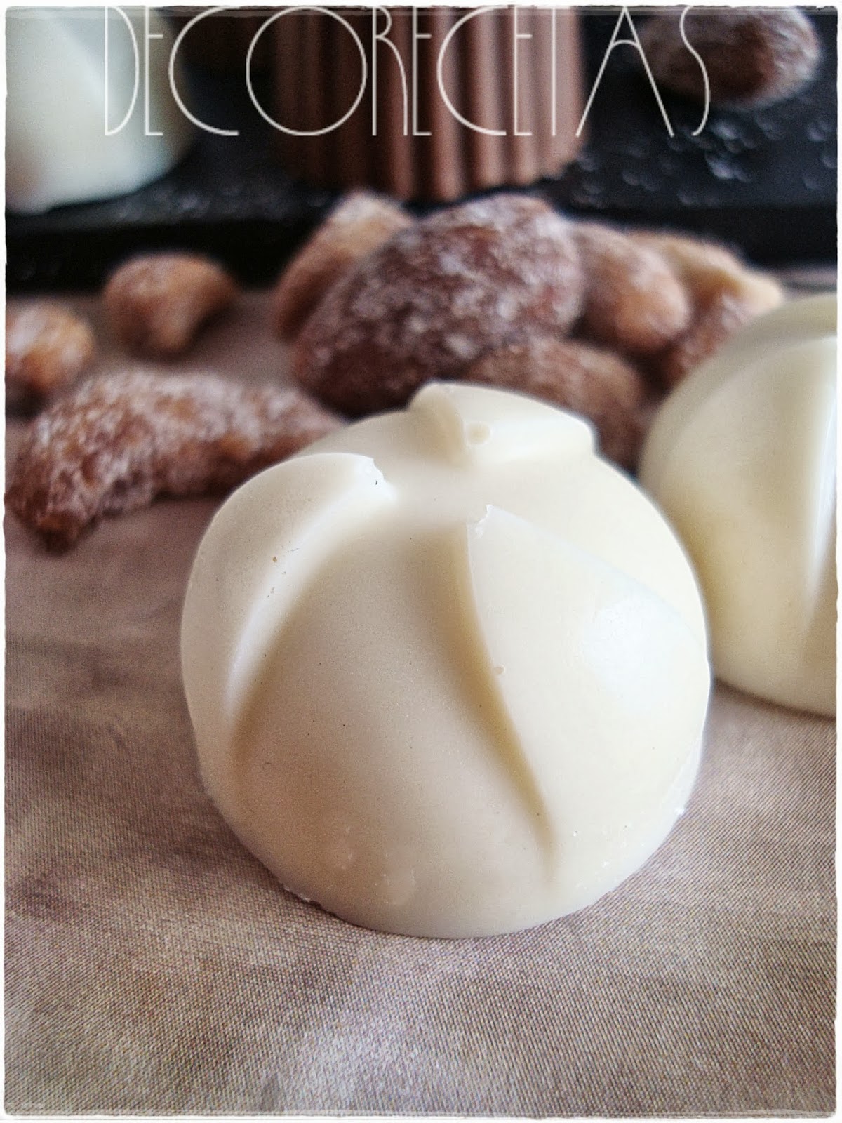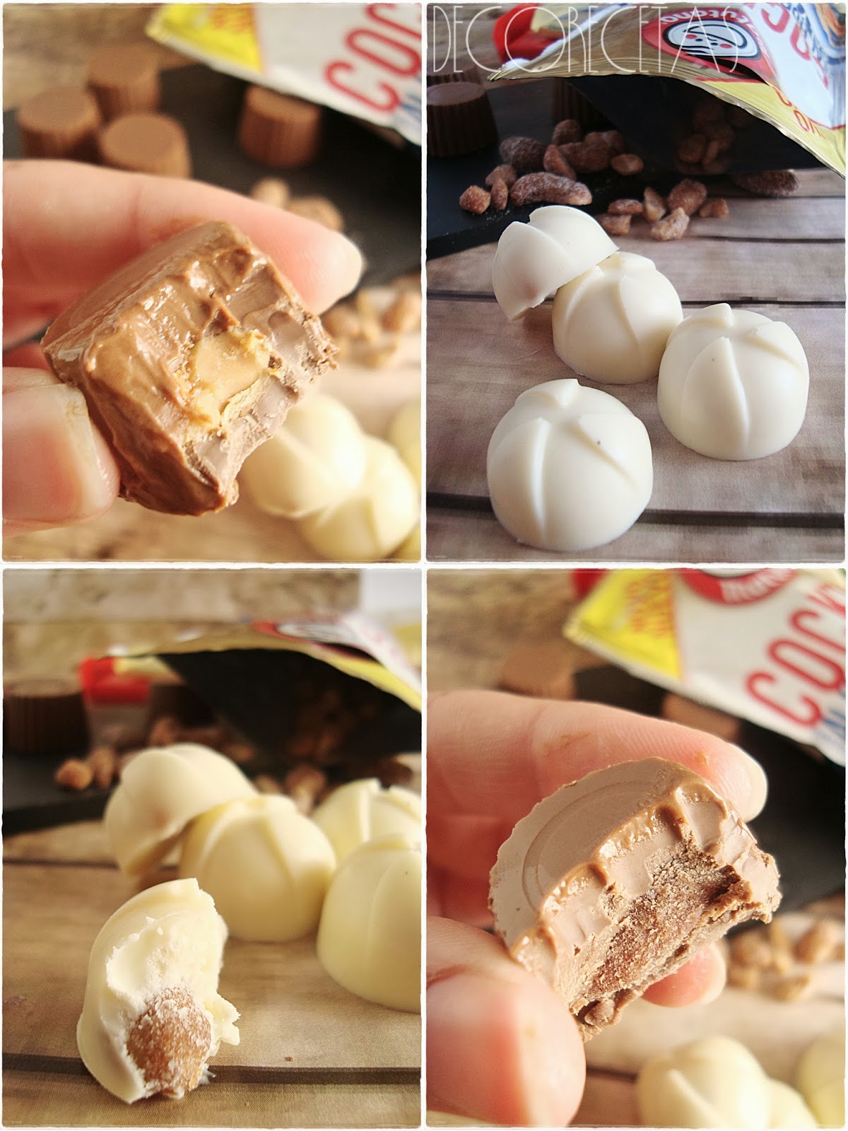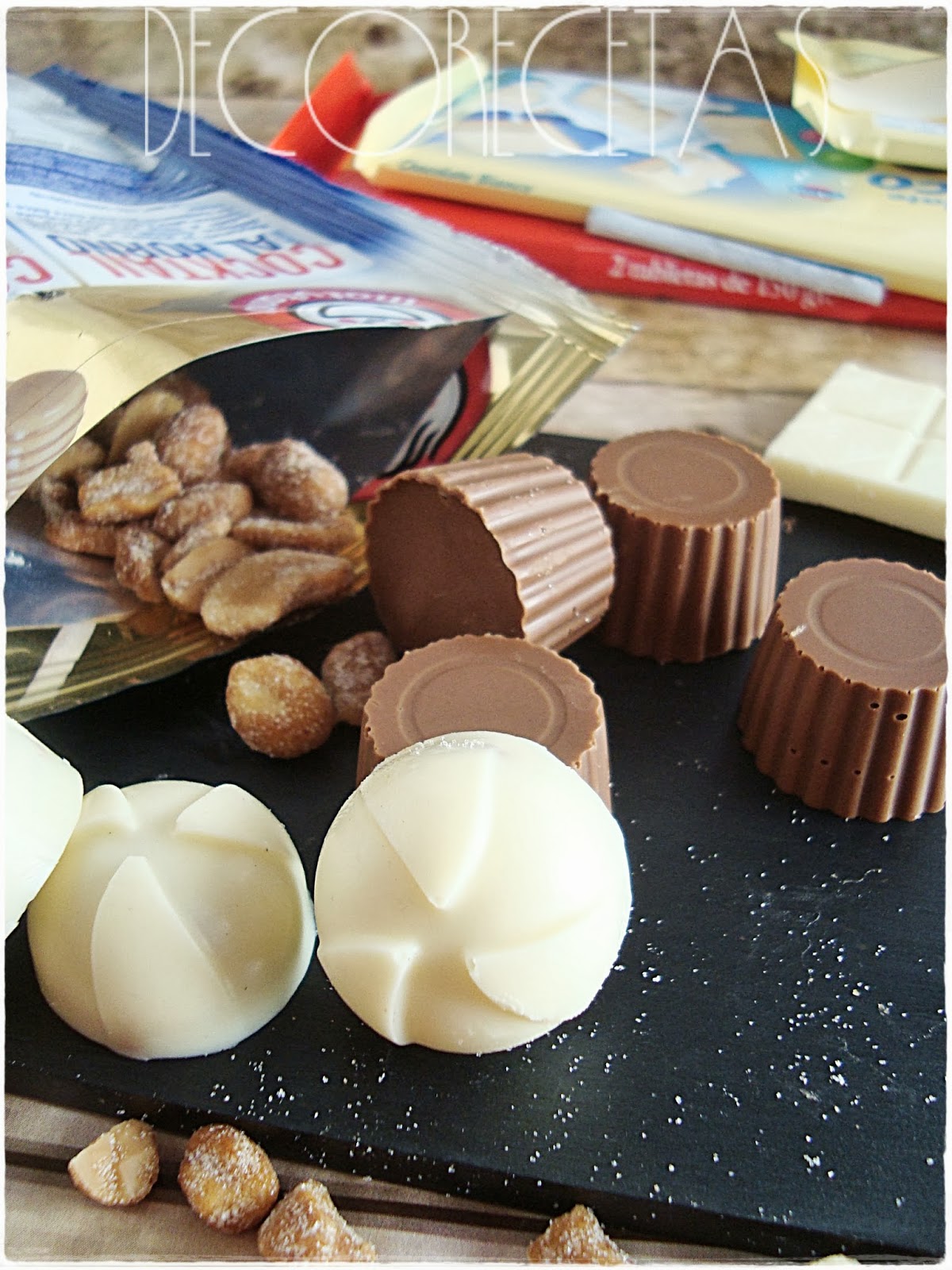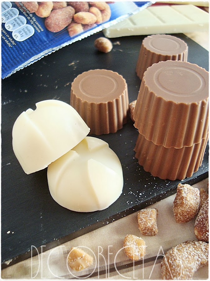 Utilicé chocolate con leche y blanco derretidos al baño maría que deposité en los moldes, introducimos el fruto seco, y tapamos nuevamente con chocolate. Dejamos enfriar con paciencia y al desmoldar...ya estas listos!!