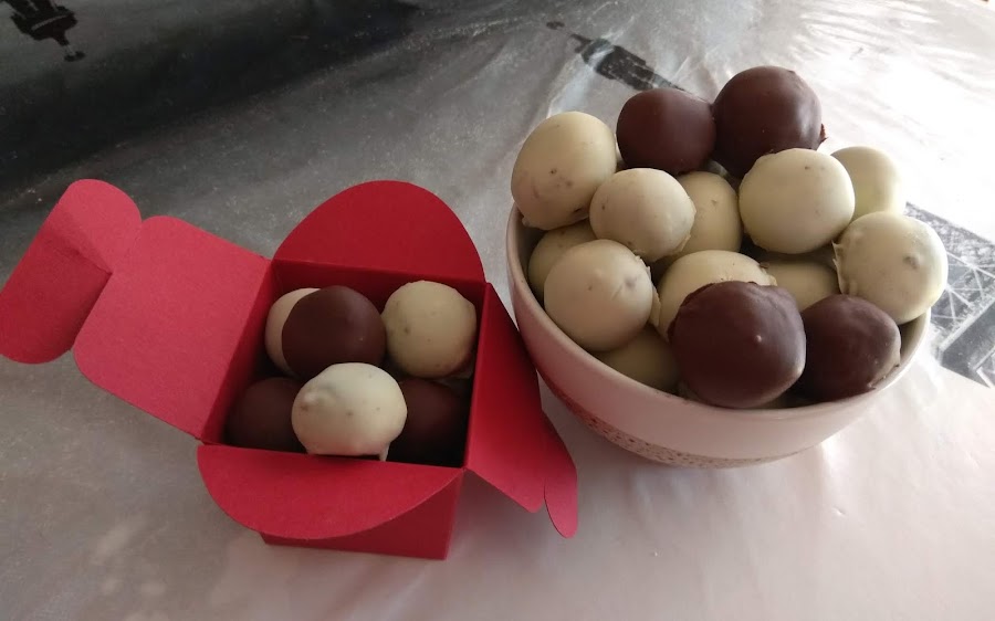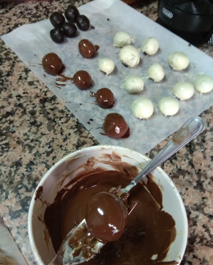 Recubrimos las bolas con el chocolate blanco, yo las he sumergido en el chocolate y con ayuda de un tenedor las he ido escurriendolas previamente dándole golpecitos para que cayera el chocolate sobrante.