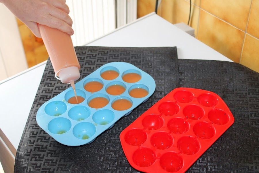 En unas cubiteras de silicona ponemos una gotita de aceite en cada cubito y las llenamos del gazpacho . Yo he utilizado un biberón de cocina para rellenarlas.