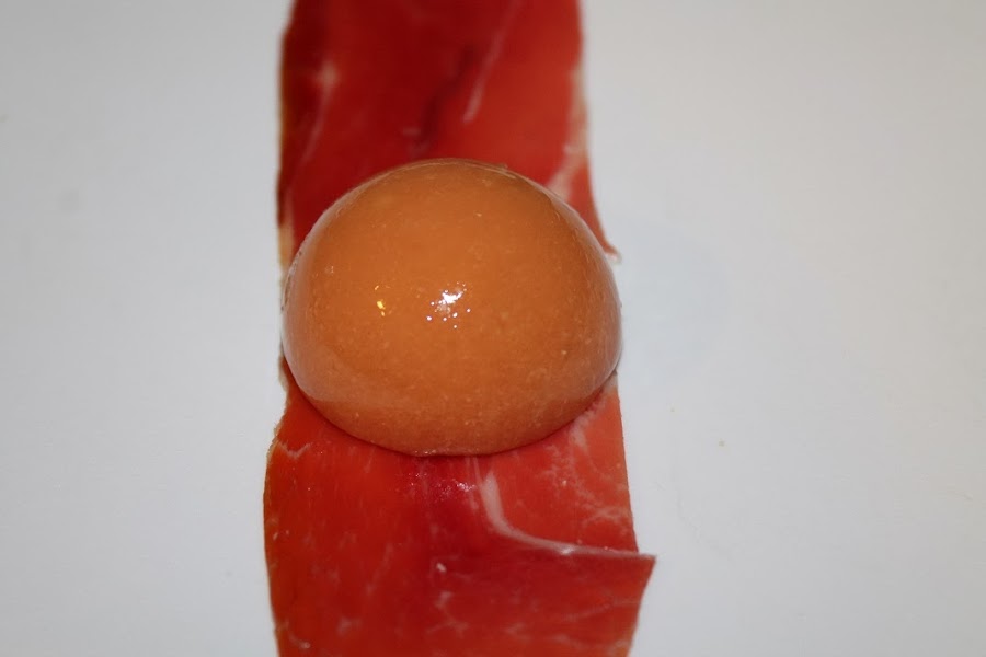 Hacemos tiras con el jamón, colocamos un cubito de gazpacho encima , como se ve en la foto y envolvemos