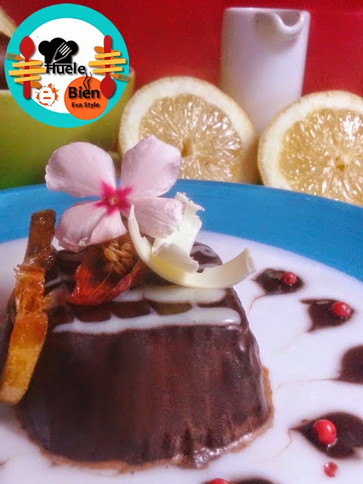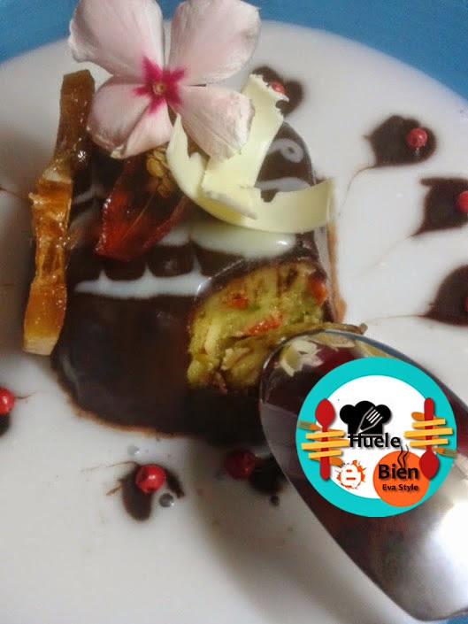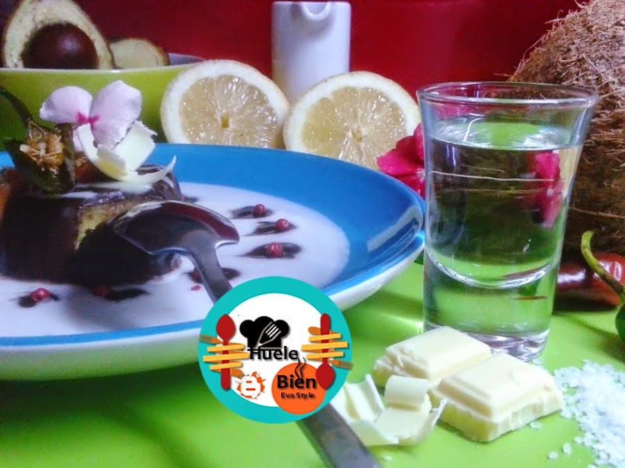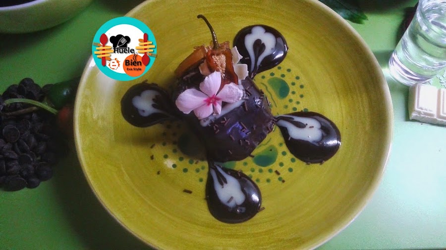 7.- Sobre el coulis de leche de coco, en el centro de las gotas ponemos un bombón. Decoramos con los chilis y la rodaja de limón caramelizada. Ponemos una flor de Begoña, con un pelador de verduras extremos unas laminas finas de chocolate blanco, las colocamos sobre el bombón y servimos.