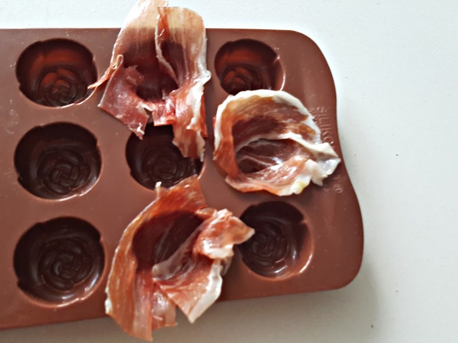 4. - Esto es lo más entretenido, yo utilizo moldes de bombones para ayudarme, pero podéis utilizar un bandeja de cubitos de hielo o algo parecido. Vamos poniendo pequeños trozos de jamón en los huecos.