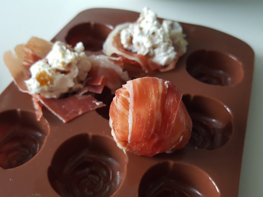 6.- Los vamos cerrando de modo que queden envueltos con el jamón, y dándoles forma redondeada.