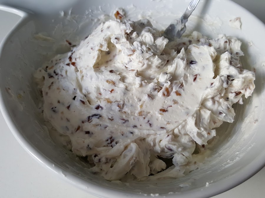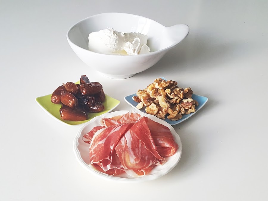 3. - Mezclamos la crema de queso con los dátiles y las nueces y metemos en la nevera, mientras preparamos el jamón.