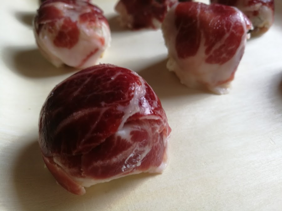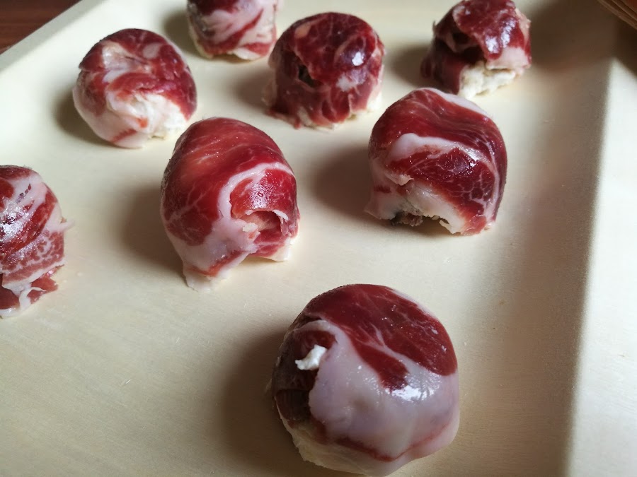 - Ponemos una cucharada de la mezcla de queso en cada agujero de la cubitera, y cerramos la bola con la loncha de jamón.