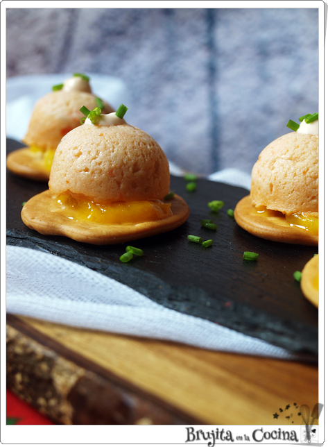 Para el montaje cortamos unas finas lonchas de mango que ponemos en la base de la galleta, colocamos un bombón encima, una puntita de mayonesa con sriracha y espolvoreamos cebollino picado.