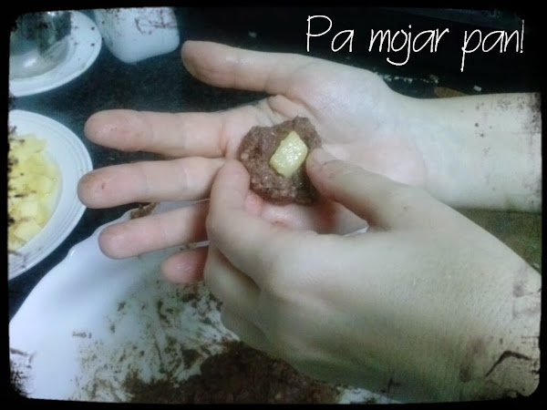 Ahora vamos cogiendo pequeñas porciones de la masa de morcilla con una mano y con la otra presionamos haciendo un hueco en el que colocaremos un dado de la manzana caramelizada. Cerramos dando forma redonda a modo de bolitas. Las reservamos en la nevera para que nos cojan consistencia.