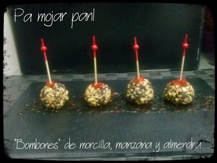 Sacamos las bolitas de morcilla de la nevera y las pasamos primero por la clara de huevo y luego por la almendra. Presionamos para ésta nos quede bien pegada a la masa.