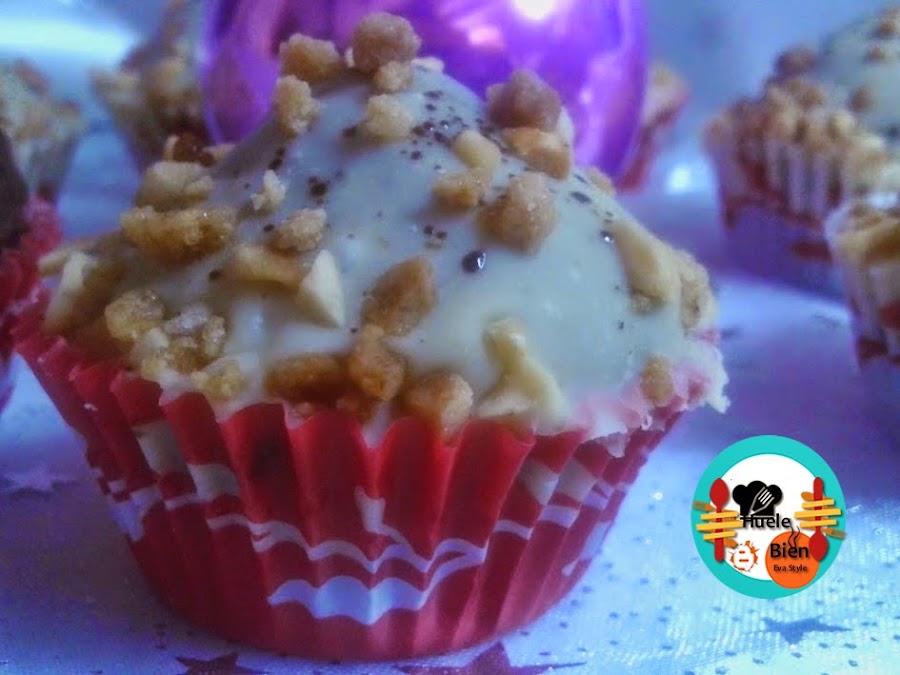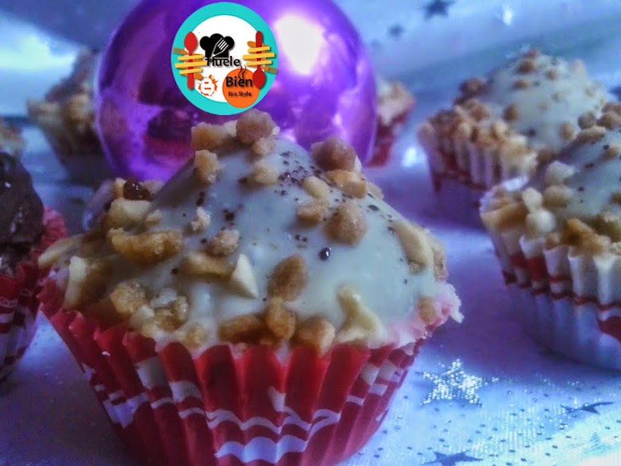 Bombones caseros de nueces con mermelada de cereza, cobertura de chocolate blanco con café soluble y crocante de almendras.