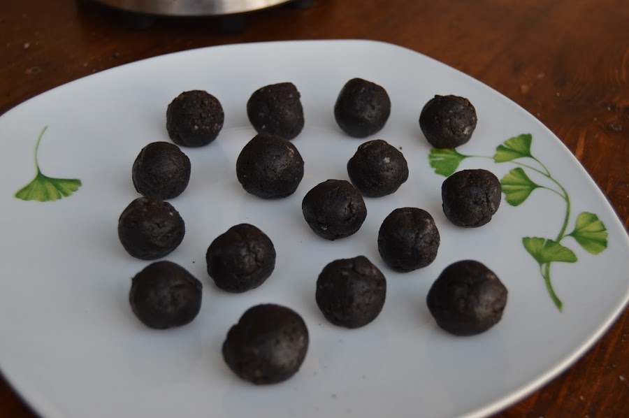 Cuando tenemos el chocolate derretido vamos introduciendo las bolitas una a una en el chocolate y las dejamos secar en un plato o las metemos en el congelador.