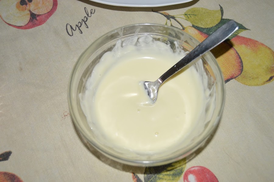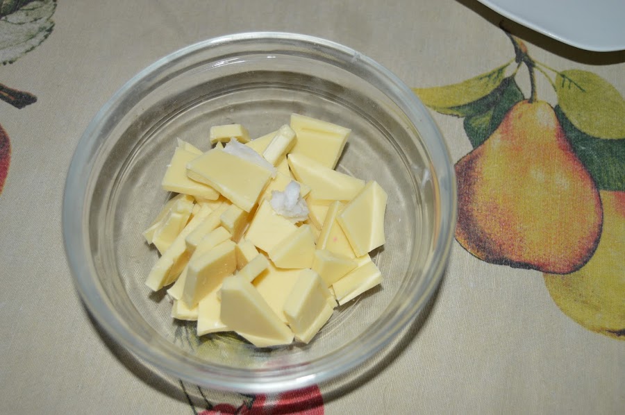 Mientras calentamos el chocolate blanco y lo metemos en un recipiente hondo.