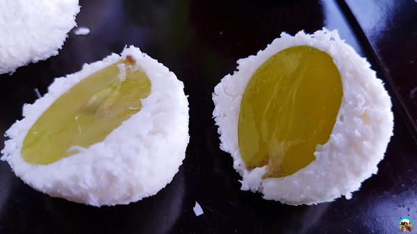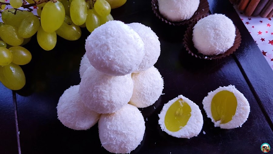 Unos bombones de queso de rulo de cabra con un ligero toque de vainilla, una capa de terciopelo de coco y un relleno de uvas frescas.