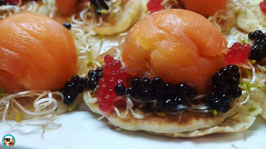 3.- En una bandeja disponemos los blinis cocinados anteriormente. Colocamos sobre cada blini unos brotes de alfalfa y un bombón de salmón. Alrededor de cada bombón disponemos una cucharadita de sucedáneo de salmón. Guardamos en un táper hasta el momento de servir.
