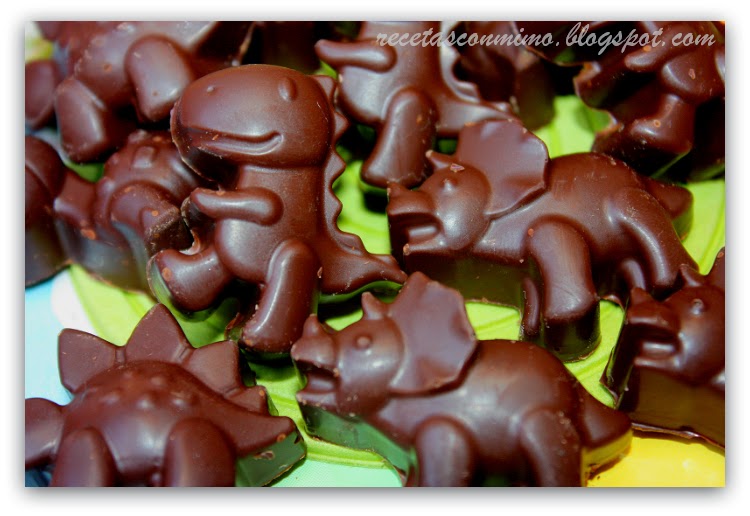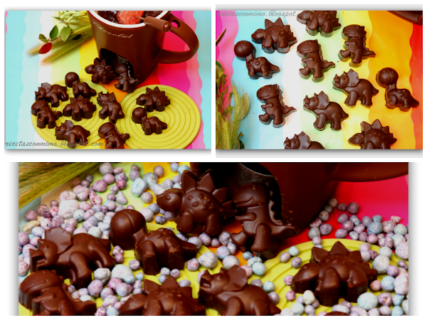 Se acerca el día de la madre y quiero compartir mi ESPECIAL DÍA DE LA MADRE, unos bombones rellenos de trufa y frambuesa. Un Especial Madres un poco peculiar porque lo que traigo aquí es más un regalo para mi hijo que para mí o para mi madre. Aunque mi regalo ha sido ver su cara al verlos... qué sonrisa!! Una madre nace en el mismo momento que nace su hijo... así que en estos días previos a ese día especial he querido hacer un poquito más feliz a mi niño mayor (que nadie vaya a pensar que es mi favorito, es que el pequeño es muy bebé y esto del chocolate como que aún no...). Él adora los dinosaurios y cuando encontré unos moldes para bombones de dinosaurios no dudé ni un segundo porque sabía la reacción que iban a provocar en el éstos bombones de trufa y frambuesa con forma de sus dinosaurios preferidos. Es fan fan...