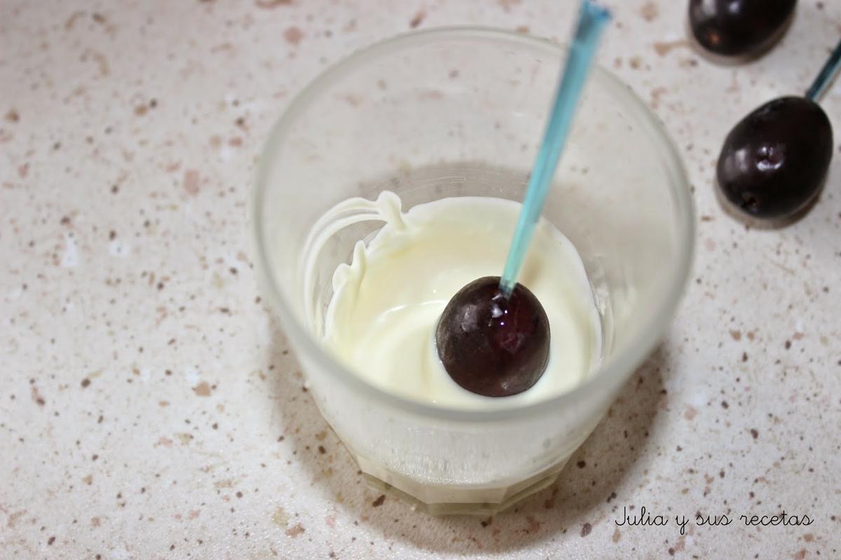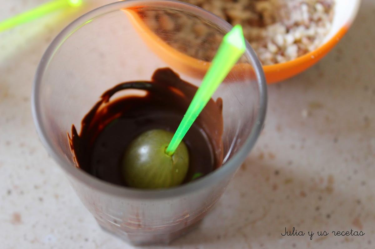 Mojamos unas uvas en el chocolate blanco y otras en chocolate negro.