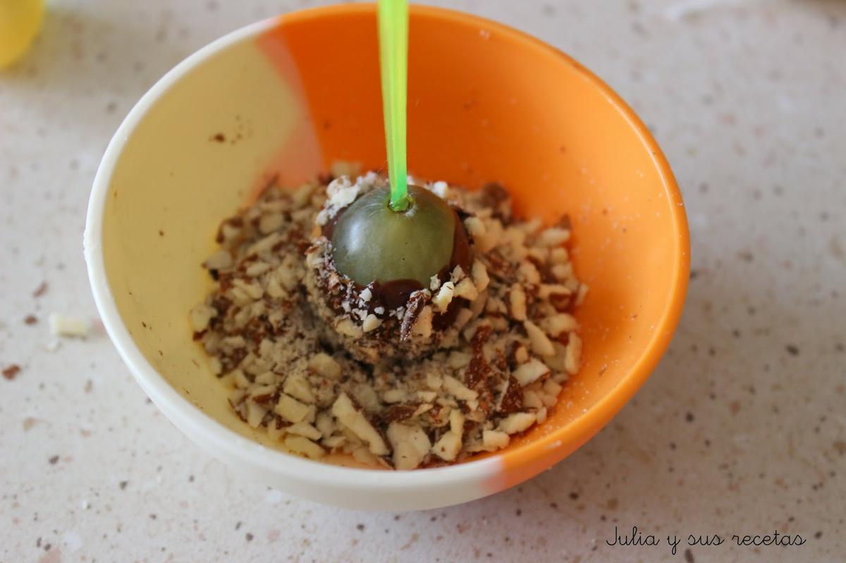 Seguidamente y antes que endurezca las rebozamos en la almendra troceada. (yo la he picado con la picadora).