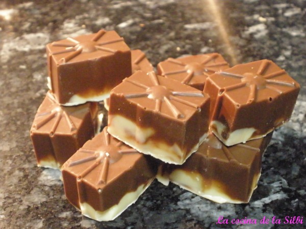 Vertemos el chocolate blanco fundido encima del con leche y la nuez de los moldes.