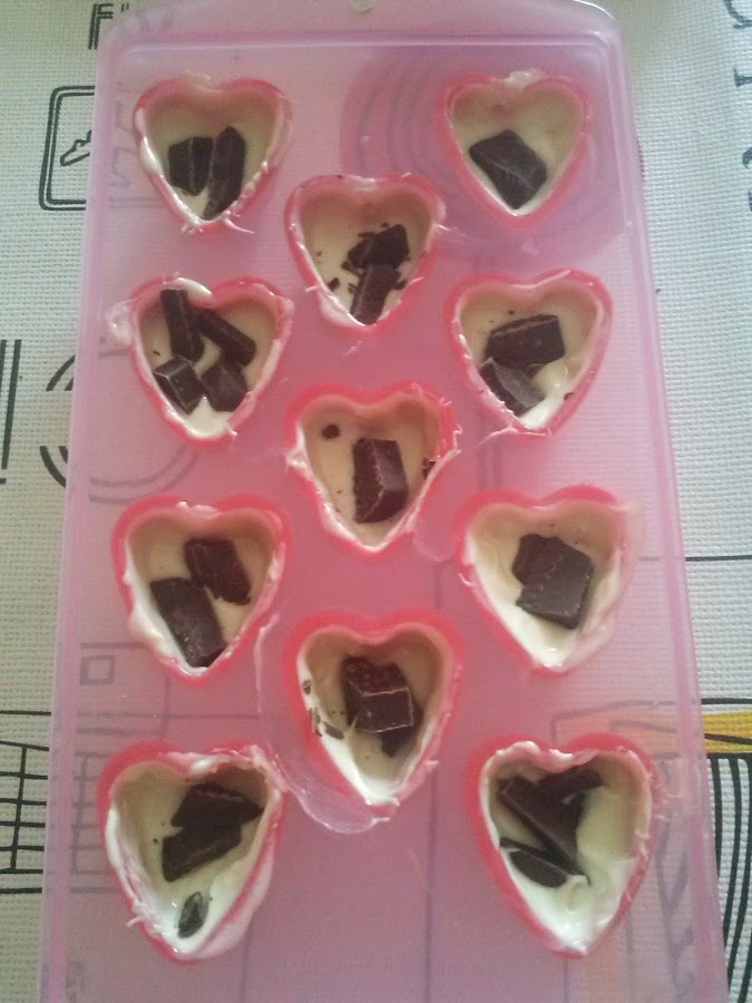 y la llevamos al congelador unos minuto,los sacamos y ponemos una cucharadita de almendras terminamos de rellenar con el mismo chocolate sin llegar hasta arriba del todo, los volvemos a introducir en el congelador otros minutillos mientras fundimos el otro chocolate , sacamos los moldes y les ponemos la capita que faltaba por rellenar , se golpean los moldes sobre la bancada para evitar posible burbujas en esta ocasión se introducen en el frigorífico tapados con film ya que el chocolate absorbe mucho los olores. Los dejaremos hasta que estén completa mente fríos para que al des moldar no se nos rompan.Yo en esta ocasión os los presento de almendras pero en otras ocasiones los hice con un trozo de otro chocolate como veis en la foto anterior o con una cereza confitada y os aseguro que también estaban de muerte.