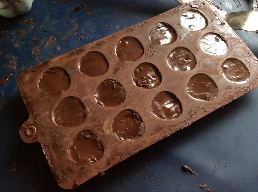 Cuando tengamos el chocolate caliente, vamos echando un poco (aproximadamente una cucharada de café colmada) en cada hueco del molde.