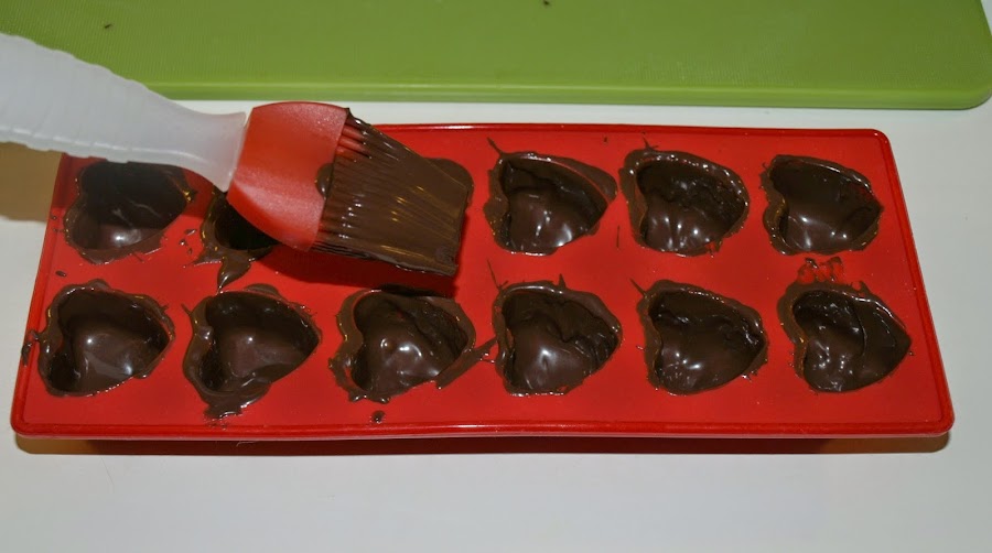 - Cuando tengamos listo el chocolate, vertemos un poco en cada hueco del molde y con la ayuda de un pincel lo extendemos por toda la superficie. Debemos cubrir todo muy bien pero sin formar una capa excesivamente gruesa. Metemos un rato en la nevera para que se enfríe bien.