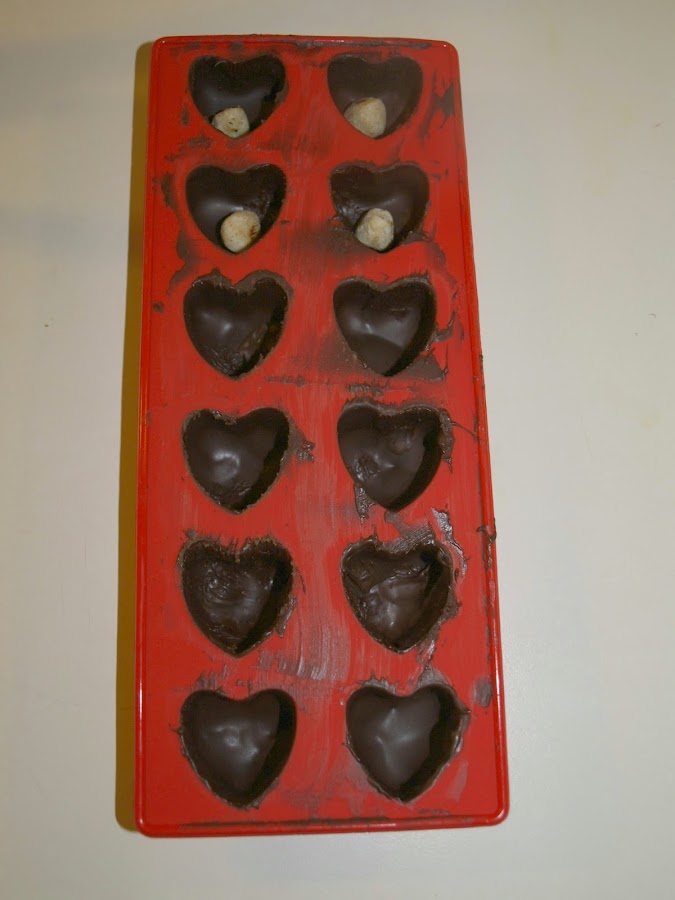 Para San Valentín o cualquier otro día, porque el amor se demuestra a diario, dando igual la fecha y sin necesidad de regalos ni tanto pasteleo. Dicho esto y a pesar de todo, de vez en cuando apetece tener un detallito con esa persona especial... y si, por qué no? en forma de corazón. Pues entonces estos bombones son ideales! :)Era mi primera vez haciendo bombones. Trabajar con chocolate siempre me ha dado respeto: las temperaturas, las texturas, etc... pero tenía el molde de los corazones y se me había metido en la cabeza usarlo. Precisamente porque yo paso de todo el tema de San Valentín, sabía que sería una gran sorpresa para mi chico, porque nunca se habría esperado nada así, jeje. Así que me animé. Elegí los bombones más sencillos, no tenía ni que preparar el relleno. Tenía poco tiempo, no sabía muy bien... los tenía que hacer a escondidas en nuestro mini-apartamento... así que con nutella y listo, y una cosa menos. Por suerte ahora se encuentra de todo sin azúcar, la crema de avellanas también y está igual de rica. Así que en versión "sugar free" para que los pudiéramos disfrutar los dos juntos, preparé mis primeros bombones. Tengo que reconocer que se me rompió alguno, pero bueno, al final terminé contenta con el resultado. A algunos de ellos les metí también una avellana entera. Qué ricos quedaron! Mi chico quedó encantando y muy sorprendido: "Das ist eine grosse Überraschung!" dijo :)