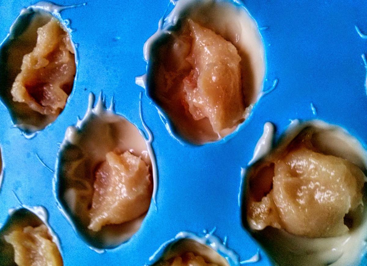 En unos moldes de silicona ve cubriendo el fondo y los laterales y en medio un poco de relleno. Termina poniendo más chocolate encima para cubrirlos. Deja enfriar en el frigorífico para que endurezcan.