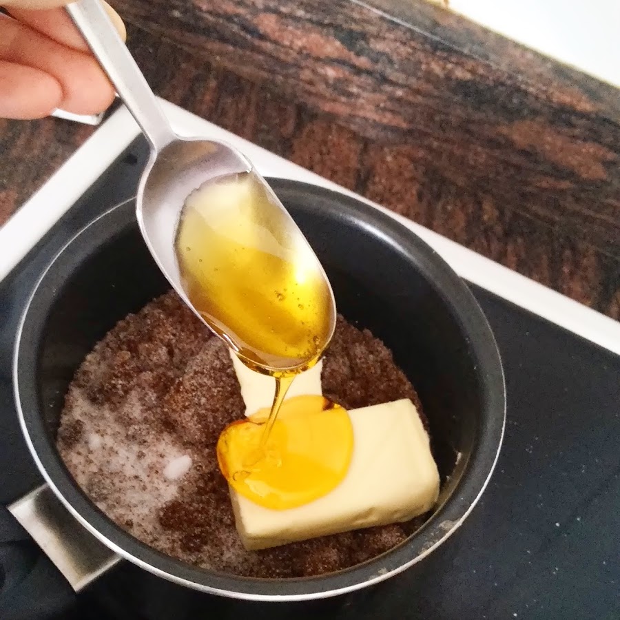 Para comenzar hacemos la salsa. Ponemos en un cazo el azúcar, la mantequilla y el sirope. Llevamos a ebullición pero a su propio ritmo y sin que en ningún momento introduzcamos una cuchara, simplemente giramos suavemente el cazo para que la mantequilla llegue a las paredes y no se nos queme el caramelo.