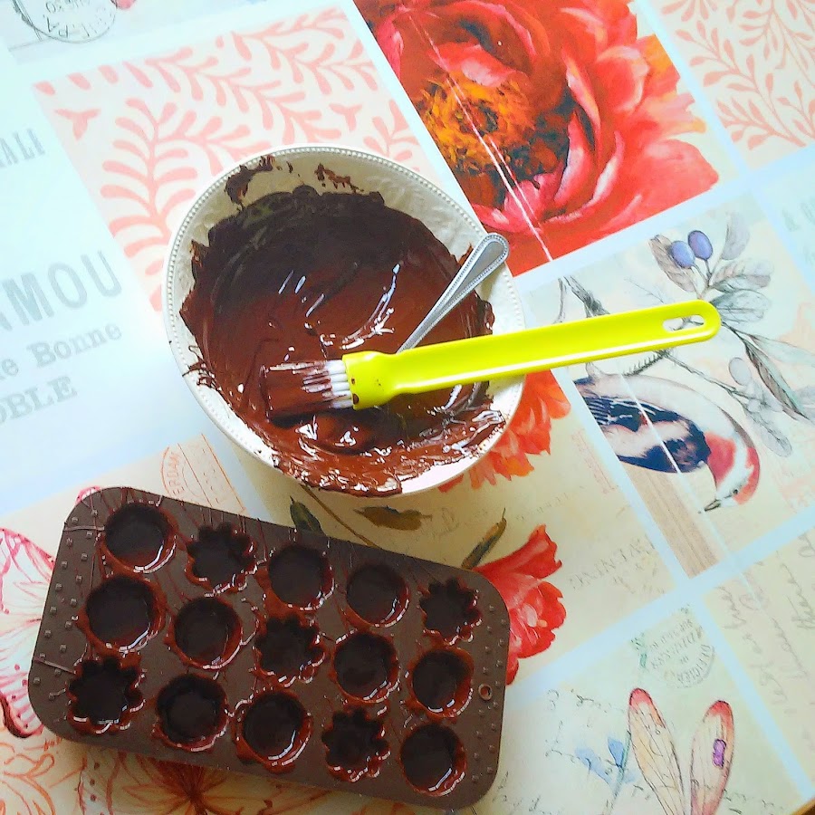 Fundimos el chocolate, con cuidado en el microondas, le añadimos una pizca de sal, mezclamos y pintamos la base y las paredes de los moldes elegidos. Llevamos a la nevera 5 minutos.