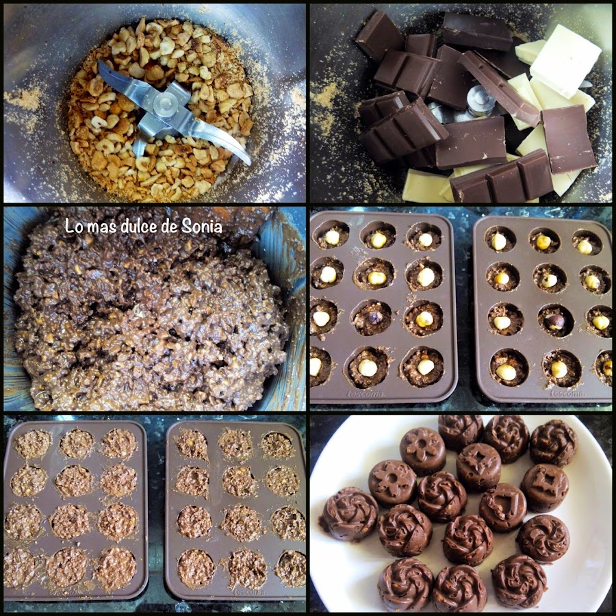Cogemos los moldes de bombones y ponemos un poquito de la mezcla, ponemos una avellana y acabamos de rellenar.