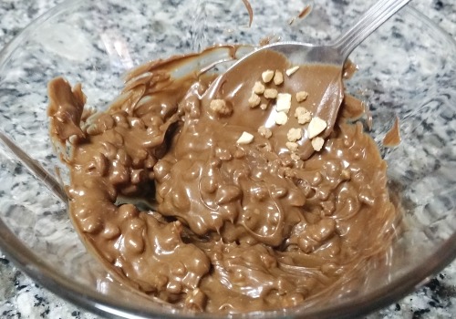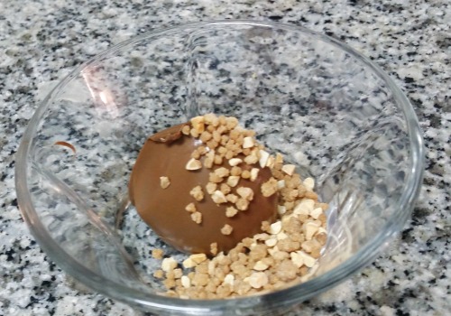 Enfriar. Poner una segunda capa de chocolate con leche en la pared y la base. Enfriar. Añadir la tercera capa en la base y las paredes. Enfriar. Poner un relleno hecho con granillo de almendra (para que quede bien crujiente) y nutella.