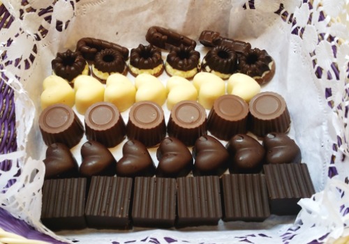 Bombón tipo 4: Poner chocolate negro en la base y en las paredes de los moldes. Enfriar. Poner un relleno de mermelada de naranja. Poner la tapa con chocolate negro y enfriar.
